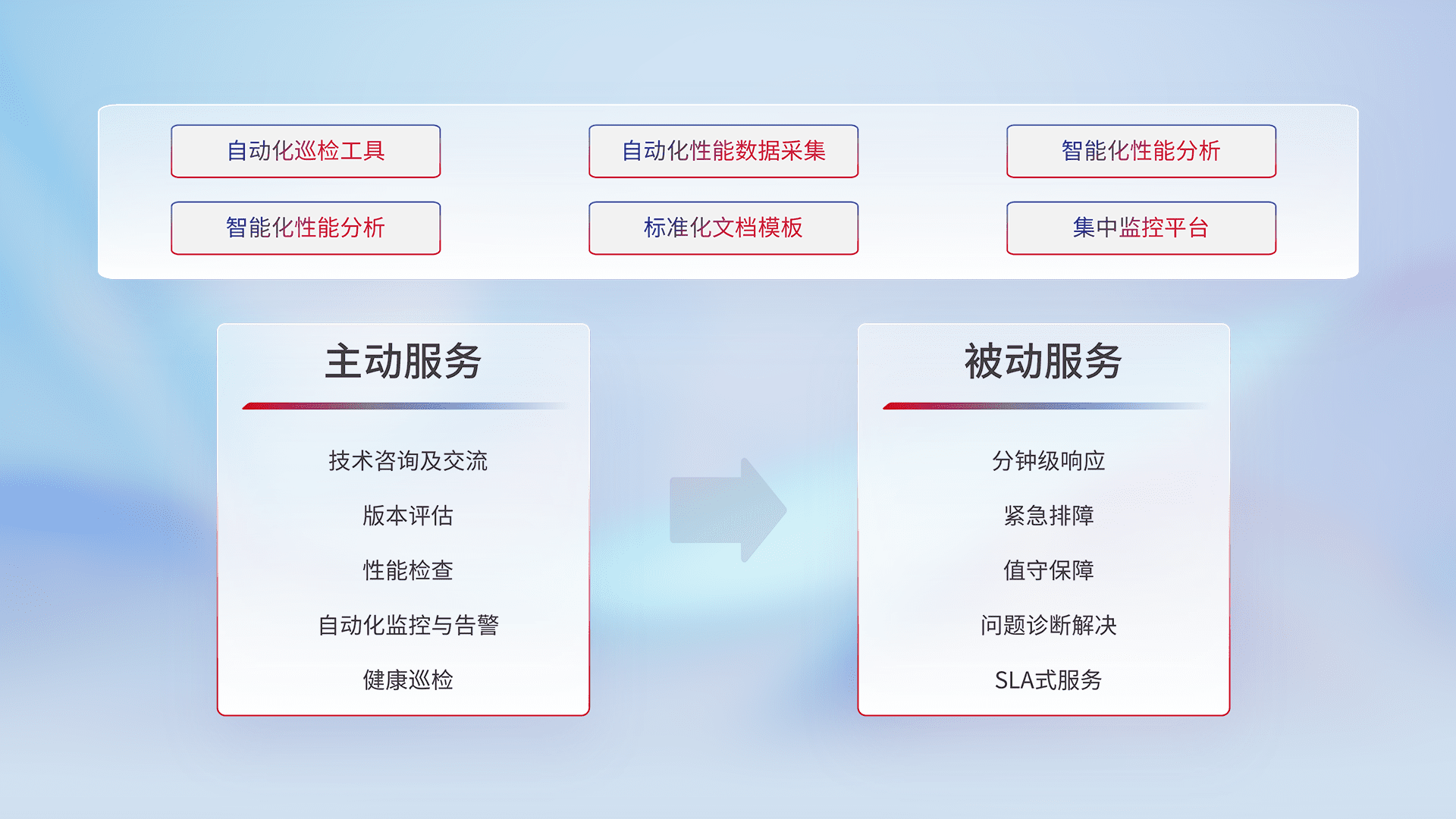 智能化工具和标准化文档,,,保障服务质量,,,,提供主动服务(包含技术咨询、、版本评估、、、、性能检查、、自动化监控与告警、、健康巡检)和被动服务包含(分钟级响应、、、紧急排障、、、、值守保障、、问题诊断解决、、SLA服务)。。。。