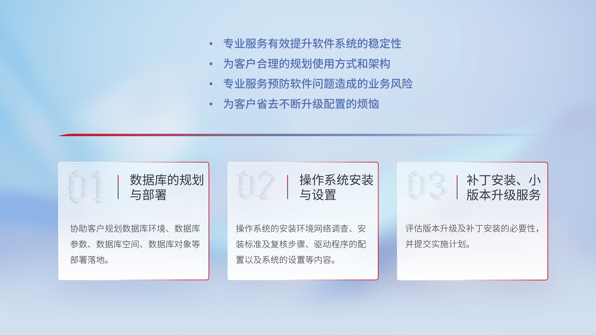 为客户提供软件规模升级、、、、快速部署、、按需配置的专业服务,,从数据库的规划与部署到操作系统的安装与设置,,,再到补丁安装和小版本升级提供支持。。